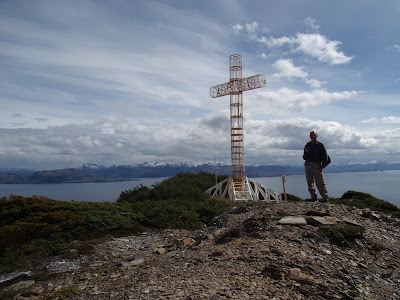 A cold night, then up to that pass, this is more like it, fine mountainous walking. Somewhat worryingly, my map says the pass takes me back into Argentina, well, the Chilean border guard said it would be fine, and indeed there's nobody here. A bit further, and another pass takes me back to Chile, and alas back down, into the land of flies. The ghastly things are so big that when I allow one to prepare to feed - necessary for me to successfully swat it - I can actually see the horrid proboscis spear into my flesh. I kill innumerable numbers of them, but there are always more. The walking is downhill now at least, then actually flat, it would be nice except there are so many deadfall trees, plus overgrown sections too, I lose the path several times, this would be impossible without my GPS. It is such a relief to finally finish the Ruta, coming onto a road with an awesome view of the Calluqueo Glacier and the laguna of the same name. A few more km before camping, only 40km left to Cochrane and civilization.